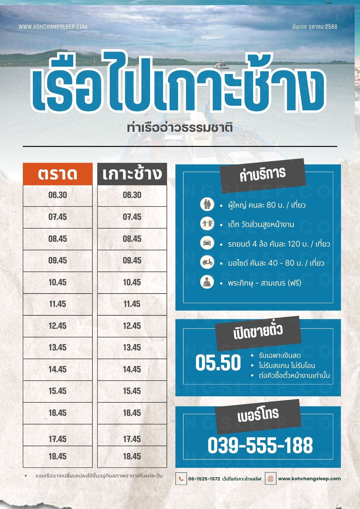 หมายเหตุ ตารางเรือไปเกาะช้างอาจเปลี่ยนแปลงได้ขึ้นอยู่กับสภาพอากาศในแต่ละวัน