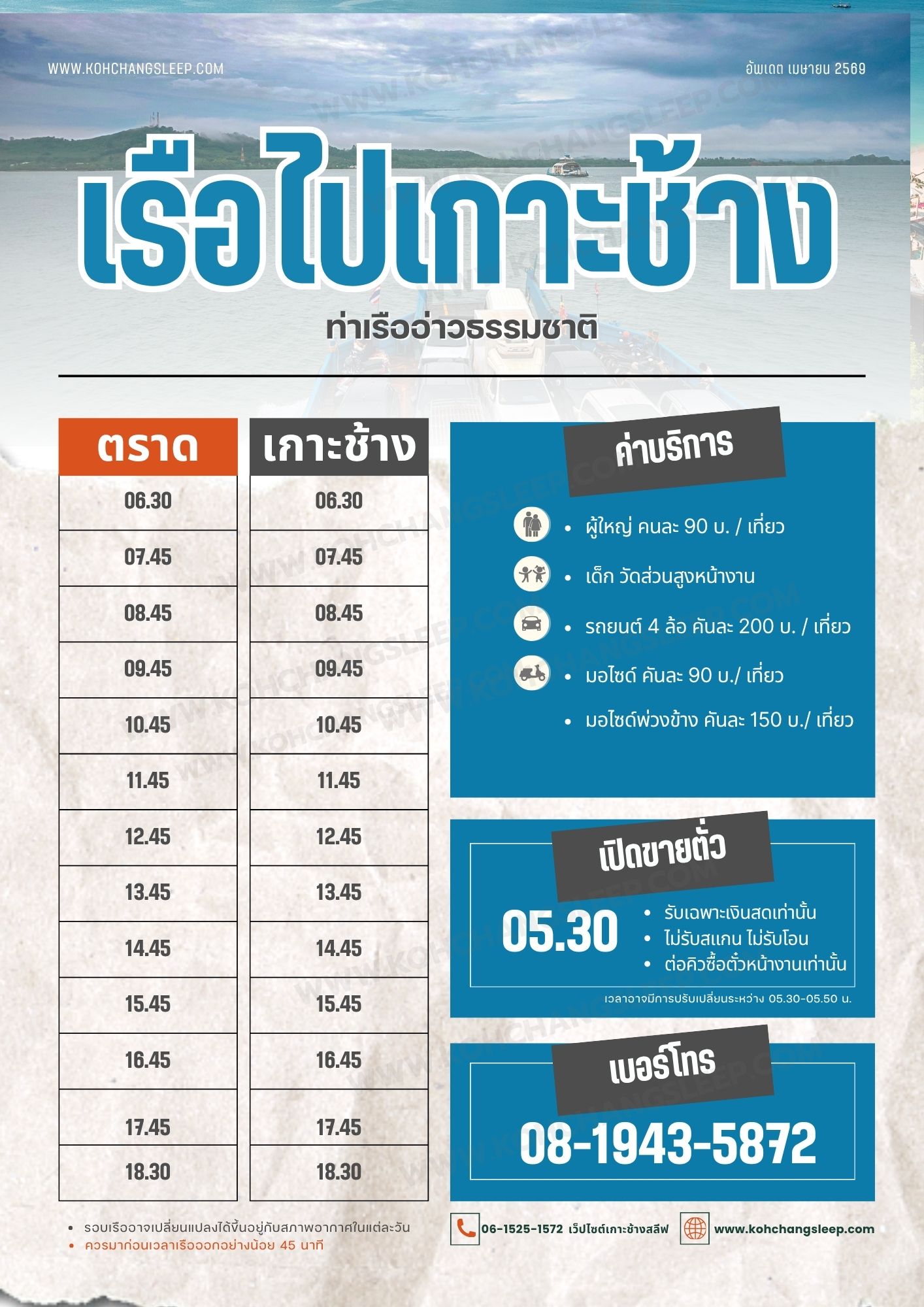 รอบเรือไปเกาะช้าง หมายเหตุ ตารางเรือไปเกาะช้างอาจเปลี่ยนแปลงได้ขึ้นอยู่กับสภาพอากาศในแต่ละวัน